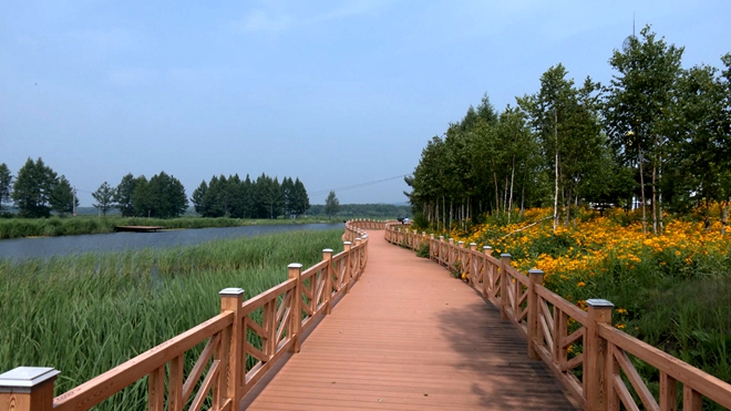 北星村党支部书记 崔树生:我们这个水面儿叫玉带湖,可以钓鱼。这个水面儿面积是2500平方,栈道长度是600米,栈道两旁有几种珍贵的树种,包括黄菠萝、柞树、山丁子,都是过去天然的自然林。最大的柞树树龄有二百多年,很珍贵,游客也非常喜欢。